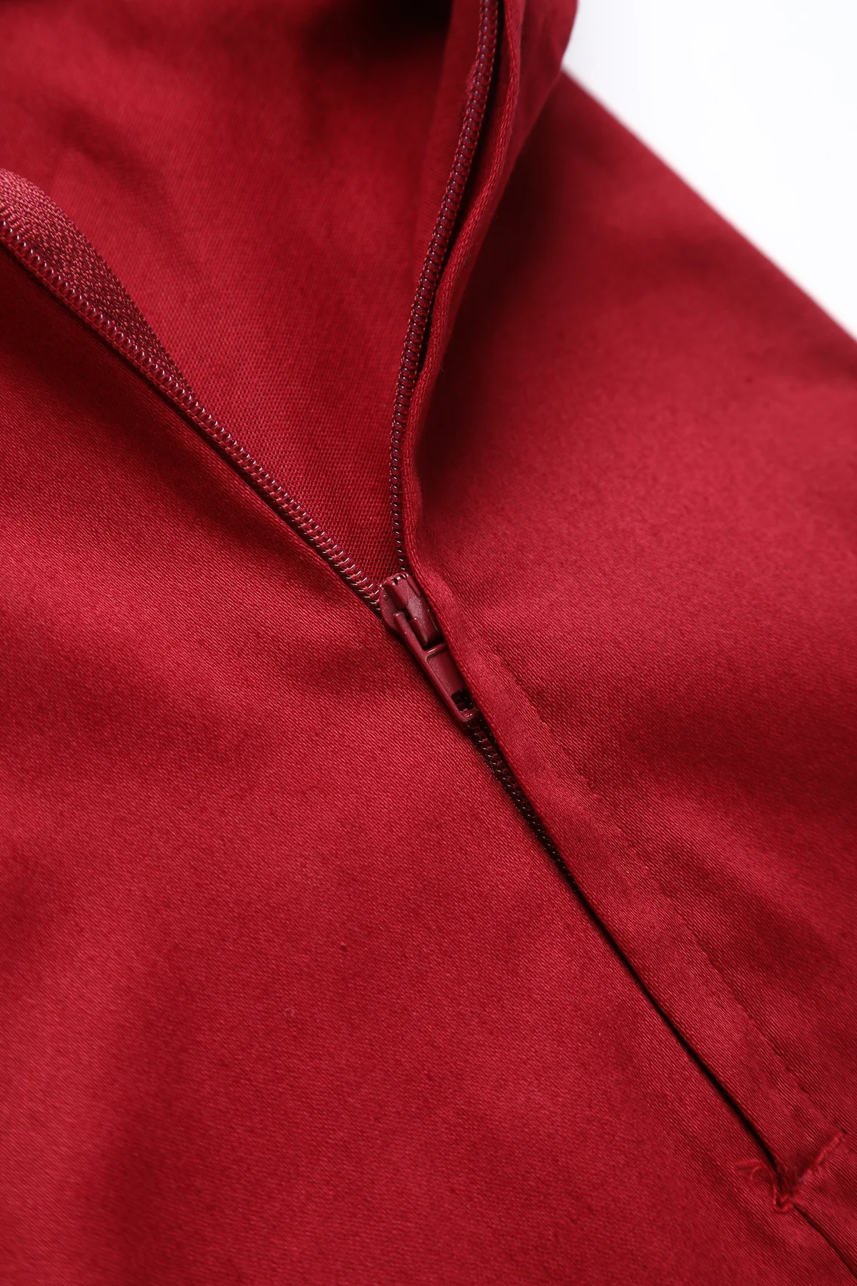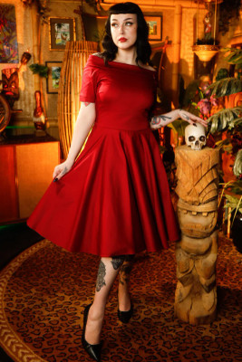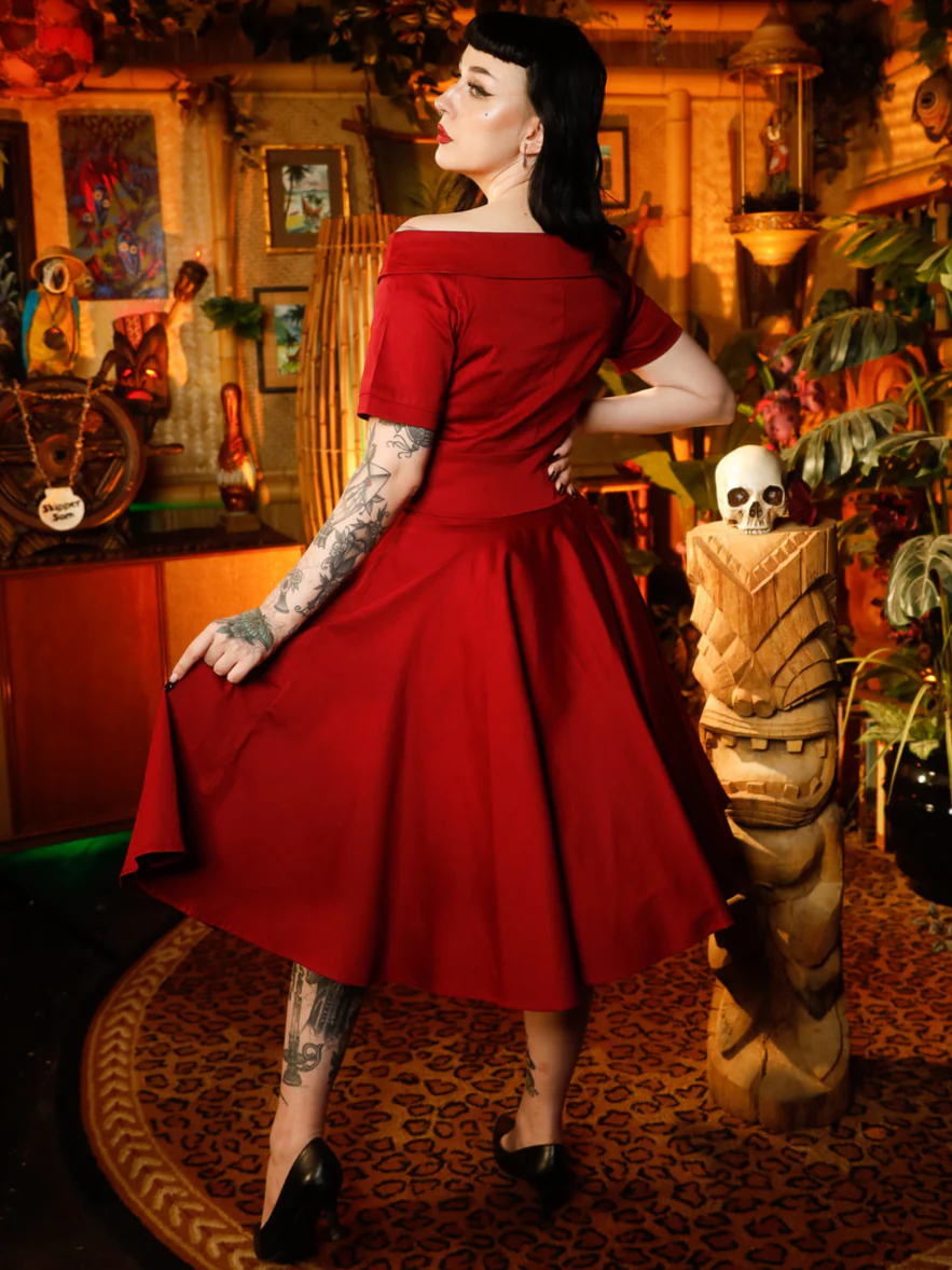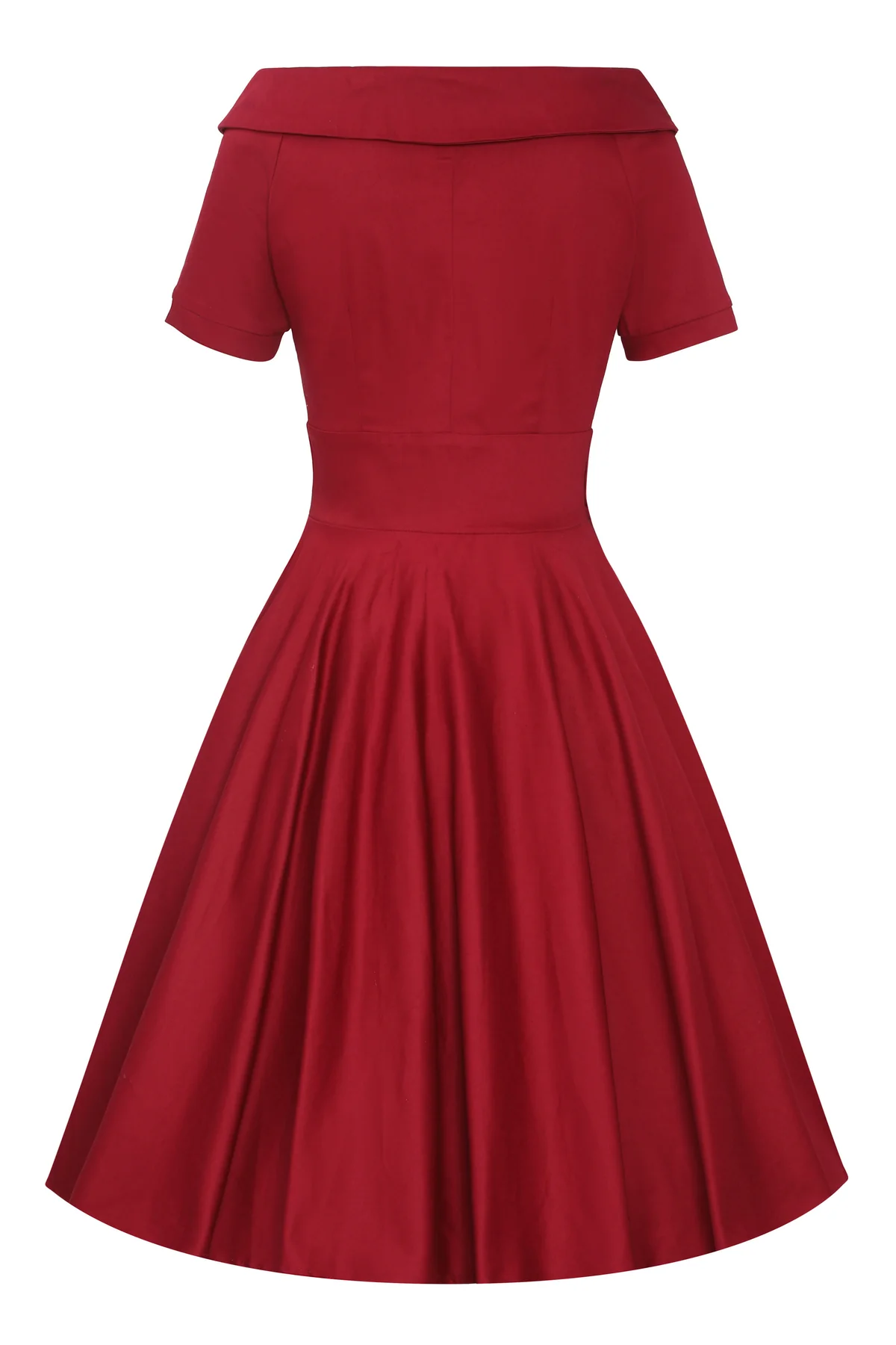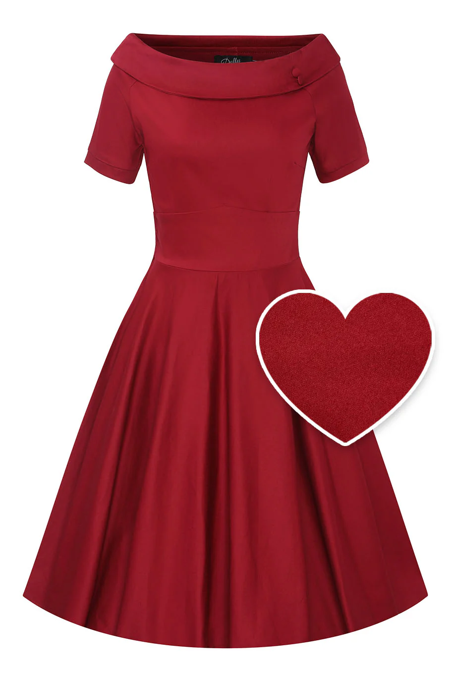 Dolly & Dottyn upeassa Darlene Burgundy-mekko on kokonaan burgundin värinen. Darlene-mekossa on avara käännetty off-shoulder-pääntie, jossa koristenapit. Mekossa on kellohelma ja lyhyet hihat, joissa kanttaukset hihansuissa. Leveä vyötärökaitale.