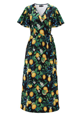 Kietaisumallinen V-pääntie korostaa kauniisti povea ja säädettävän vyötärönauhan avulla voit kiristää täydellisen istuvuuden. Perhoshihat lisäävät kevyttä ja ilmavaa tunnetta, ja kauniisti laskeutuva nilkkapituinen helma sivuhalkioilla varmistaa elegantin liikkeen jokaisella askeleella.