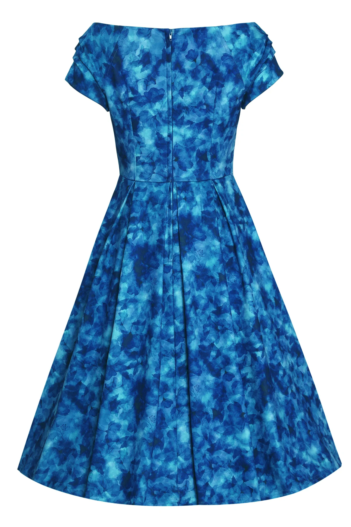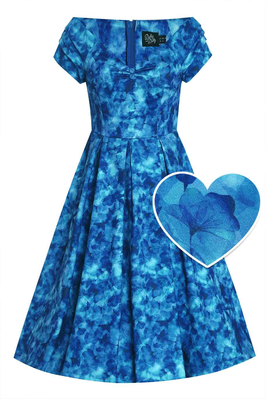 Dolly & Dottyn upeassa Lily-mekossa on hurmaava sininen kukkakuviointi sinisellä pohjalla. Tässä vintagetyylisessä mekossa on avara off-shoulder-pääntie, ja povessa kaunis sweetheart-leikkaus, jonka kruunaa 2 nappia. Mekossa on vekitetty kellohelma ja lyhyet hiukan rypytetyt hihat.