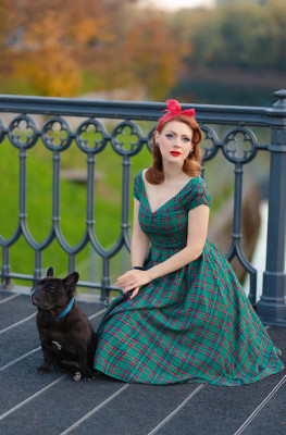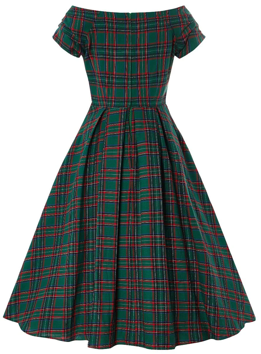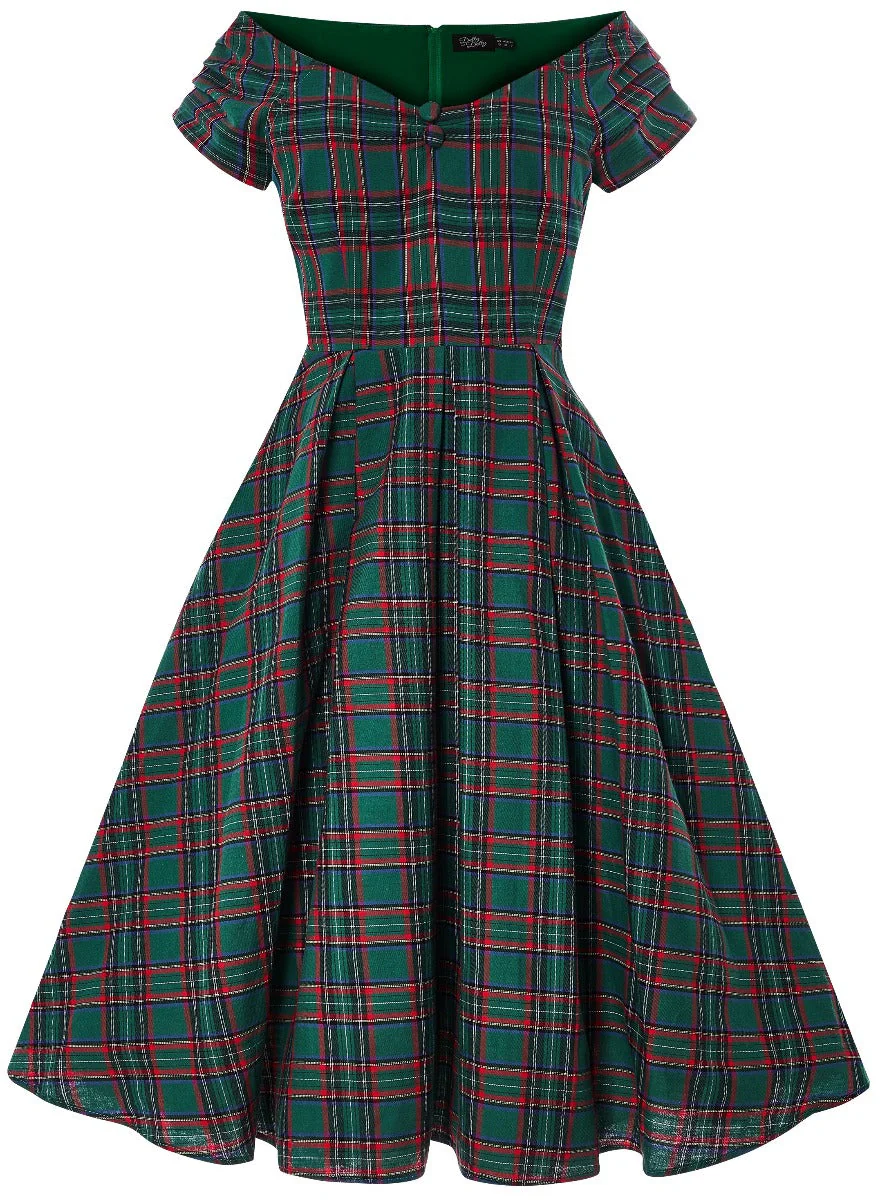 Dolly & Dottyn upeassa Lily Green Tartan-mekossa on klassisen kaunis ruutukuviointi. Mekossa on avara off-shoulder-pääntie, ja povessa kaunis sweetheart-leikkaus, jonka kruunaa 2 nappia. Mekossa on vekitetty kellohelma ja lyhyet rypytetyt hihat.