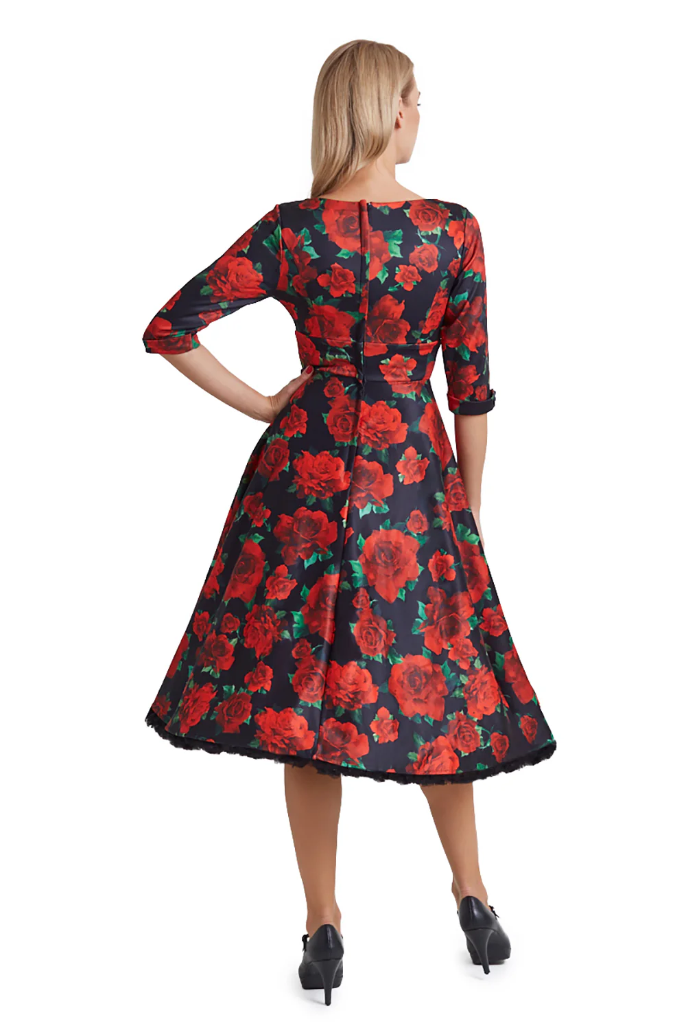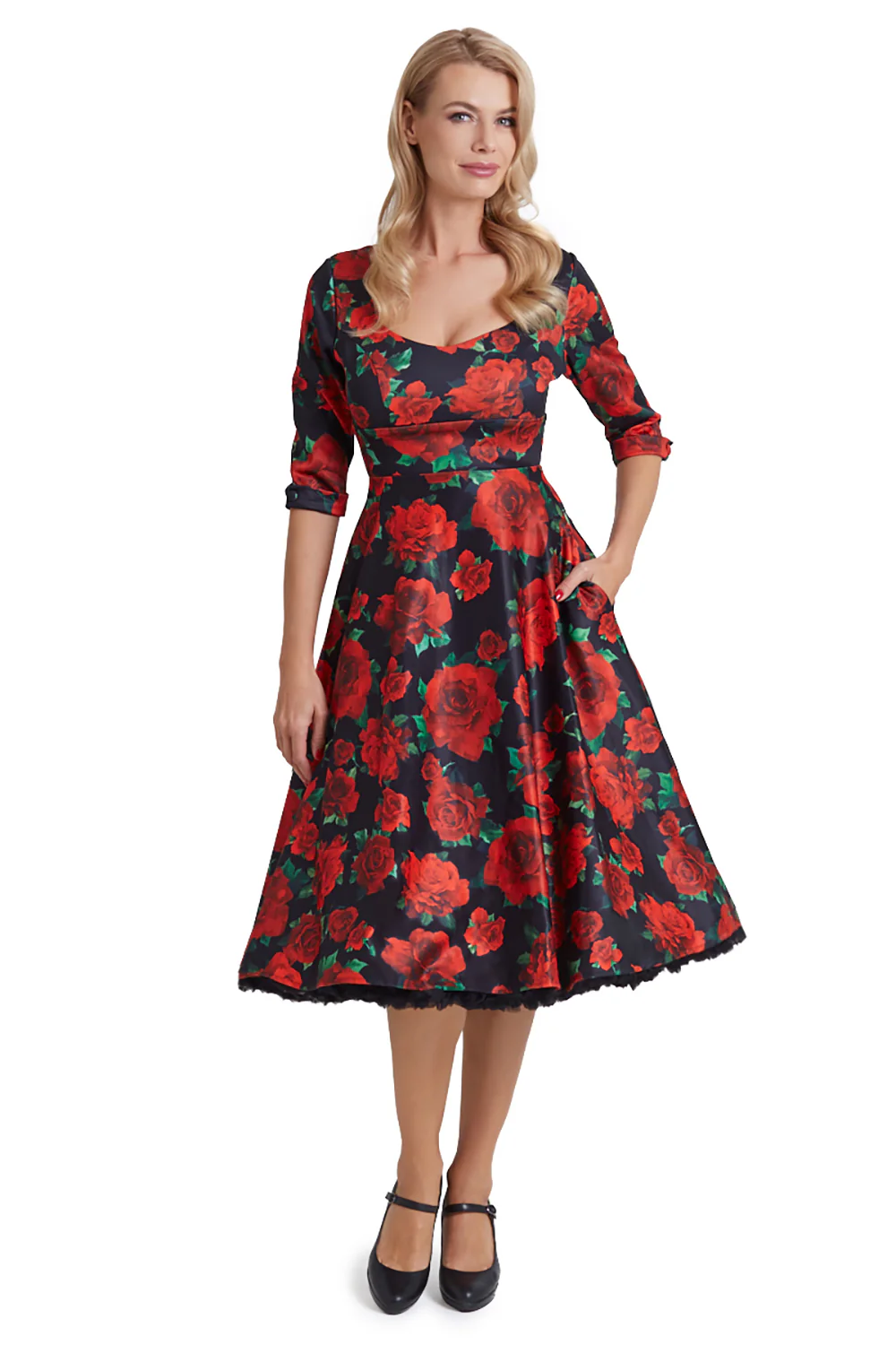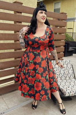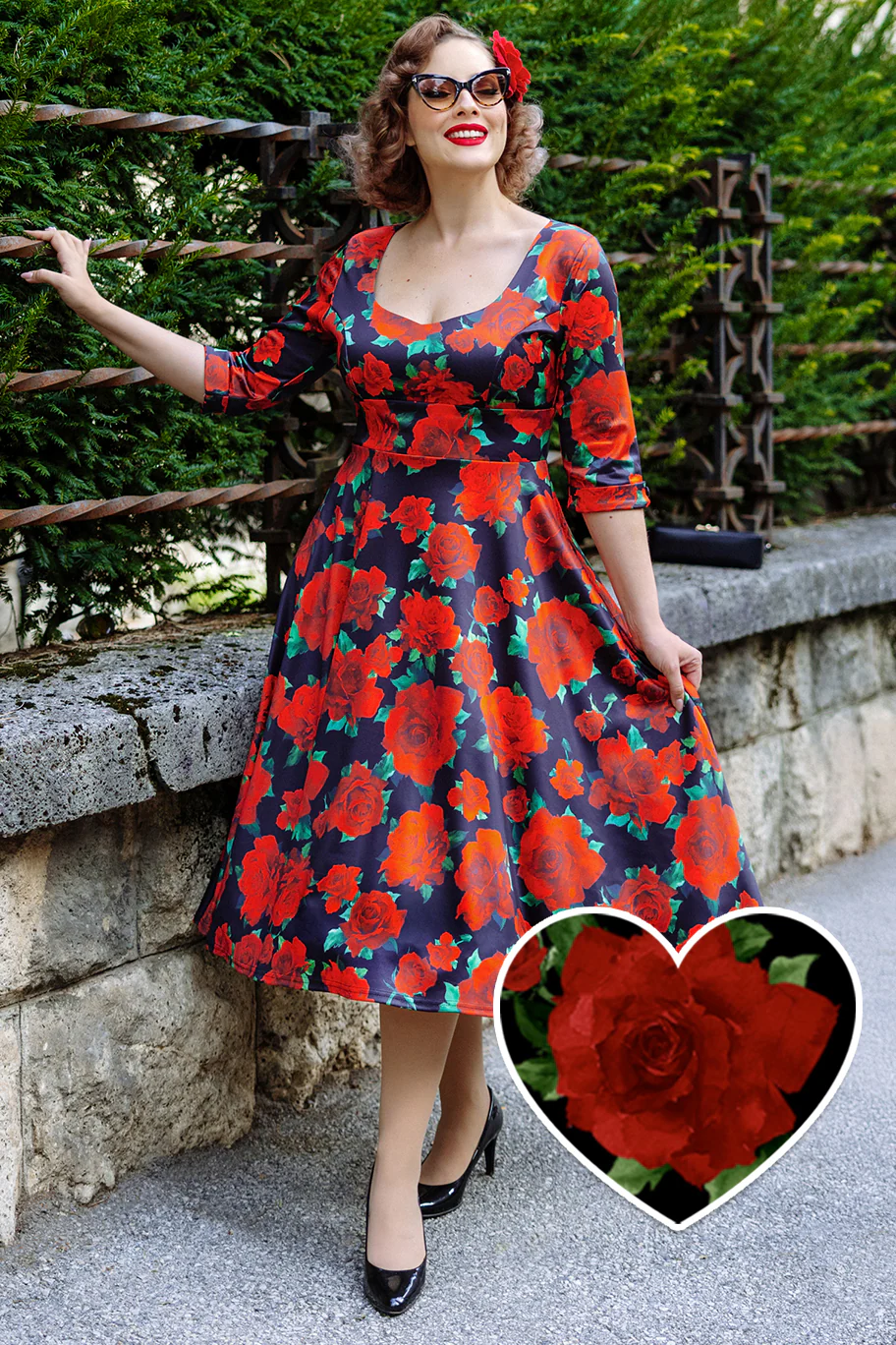 Dolly & Dottyn upeassa Scarlette -mekossa on lumoavan kaunis punainen kukkakuviointi tummansinisellä pohjalla. Mekossa on imarteleva leikkaus: kaunis, povea korostava sweetheart-pääntie luo naisellisen siluetin. Scarlette -mekon 3/4-pituiset hihat tuovat ripauksen eleganssia ja ovat miellyttävät viileämpinäkin päivinä. Lisäksi mekossa on huomaamattomat piilotaskut sivuilla – täydelliset pienille tavaroille.