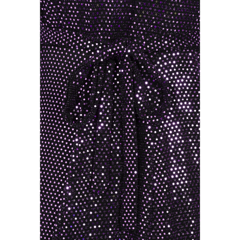 Lontoossa ammattitaidolla valmistettu Lyra -mekko on valmistettu pehmeästä ja todella joustavasta kankaasta (92% polyesteriä, 6% elastaania), joka tarjoaa mukavuutta ja imartelevaa istuvuutta. Kankaassa on metallisia violetin värisiä paljetteja (2% kankaasta).